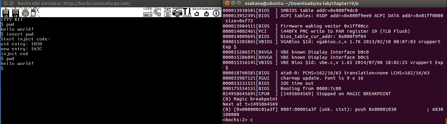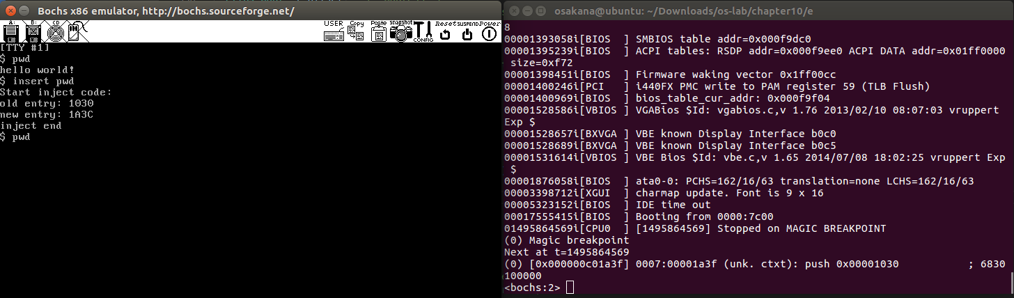 嵌入代码用一个 char 类型的数组存放,这里很简单,我们仅仅是嵌入了一个断点调试代码(xchg bx, bx),然后将原入口地址压栈并返回,继续执行原程序的代码。