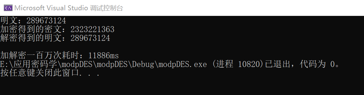 可以看出,明文和密文都是模 p^2 的数,加解密一百万次仅耗时 11886 毫秒,速度很快。