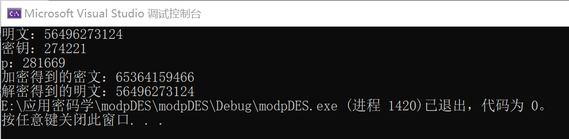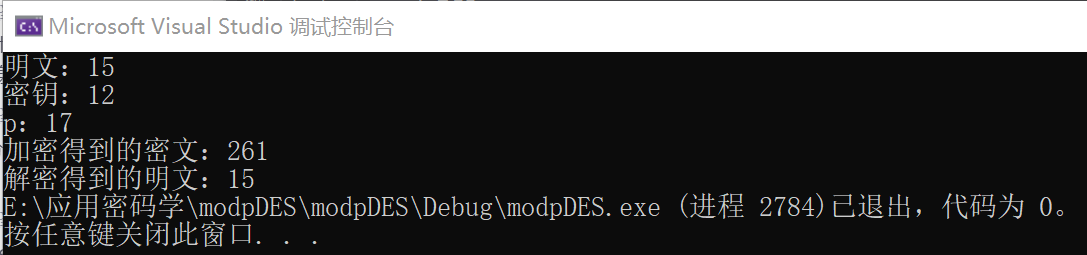 可以看出,加解密过程正确,且明文和密文空间均模 p^2,满足要求。